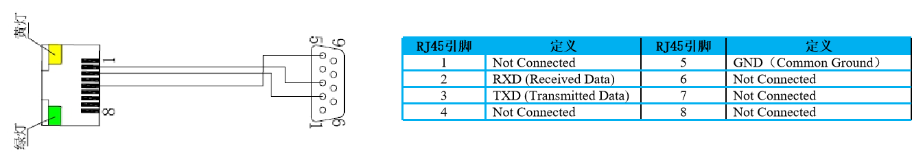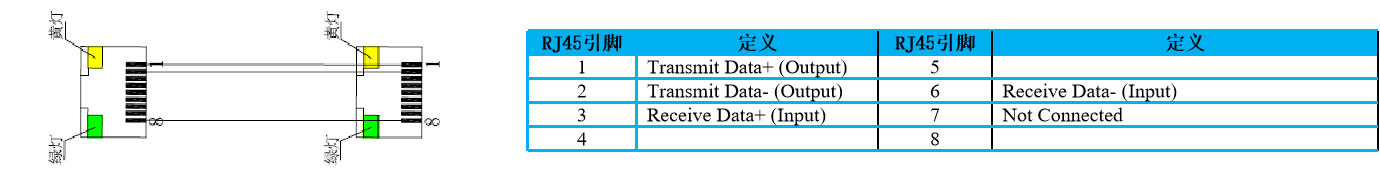 DRAC-200含有2个独立的100/10M以太网口RJ45型接口,黄灯是数据灯,绿灯是连接灯。端口连接上网络后,绿灯亮;端口上有数据发送或接收时,黄灯闪烁,没有数据传输时,黄灯熄灭。以太网接线图如下图所示: